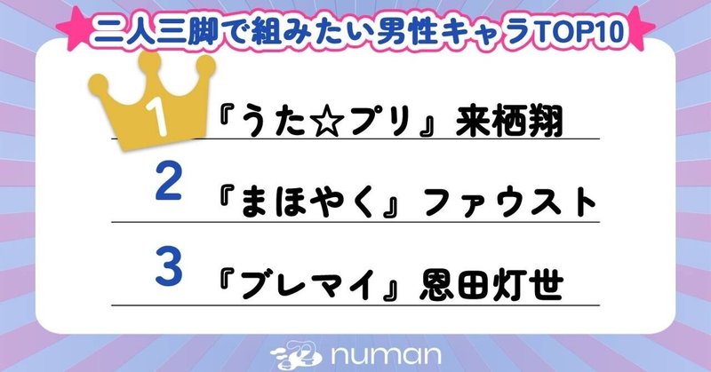 1位は『うた☆プリ』来栖翔! 二人三脚で組みたい男性キャラTOP10『まほやく』ファウスト『テニプリ』謙也『ブレマイ』灯世『ハイキュー』西谷etc