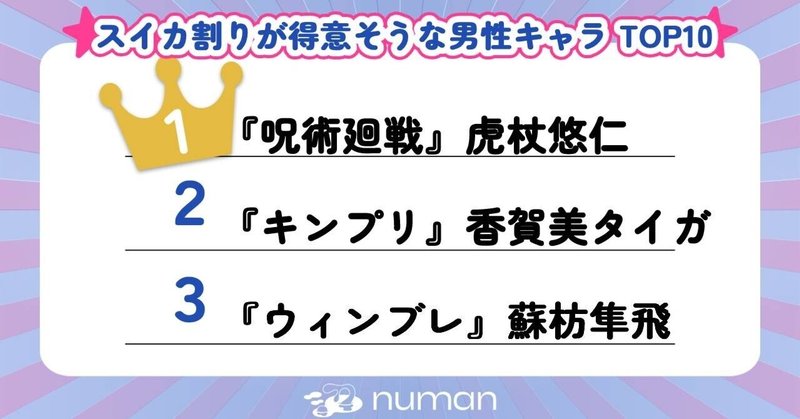 1位は『呪術』虎杖!スイカ割りキャラが得意そうな男性キャラTOP10『キンプリ』香賀美タイガ『銀魂』銀時『ウィンブレ』蘇枋『まほやく』カインetc