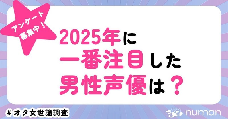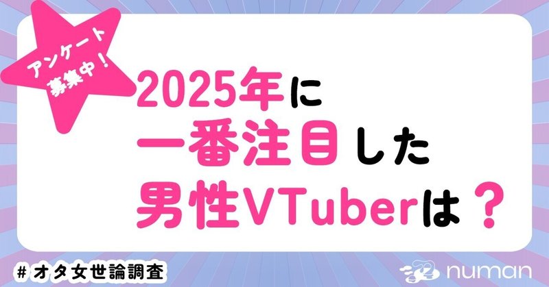 【2025年に一番注目した男性VTuber】アンケート大募集今年も多彩な方面で、男性VTuberの躍進が話題になりました。 numan編集部では「2025年に一番注目した男性VTuberは?」というアンケート調査を実施します。選択肢にいない方は「その他」へ。みなさまの熱いコメントをお待ちしています! (所要時間1分程度) 過去のアンケート結果はこちらバックナンバー一覧#エンタメ #推し #アンケート #にじさんじ #VTuber #バーチャルYouTuber #ライバー #