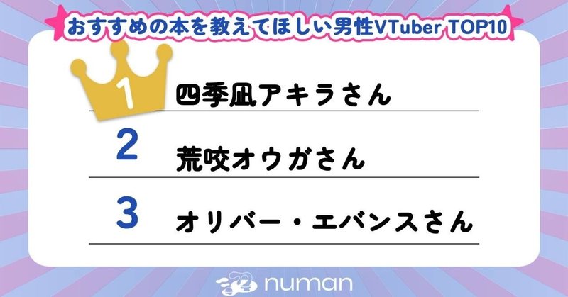 1位は四季凪アキラ! おすすめの本を教えてほしい男性VTuber TOP10 剣持刀也、オリバー・エバンス、荒咬オウガ、佐伯イッテツ