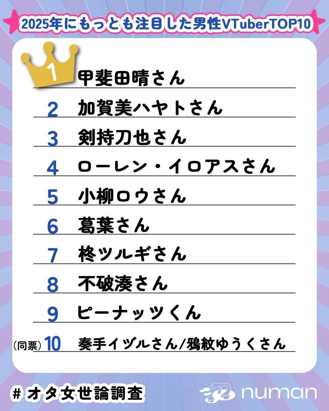 numan編集部では「2025年にもっとも注目した男性VTuberは?」というアンケート調査を実施し、結果をランキング化しました。