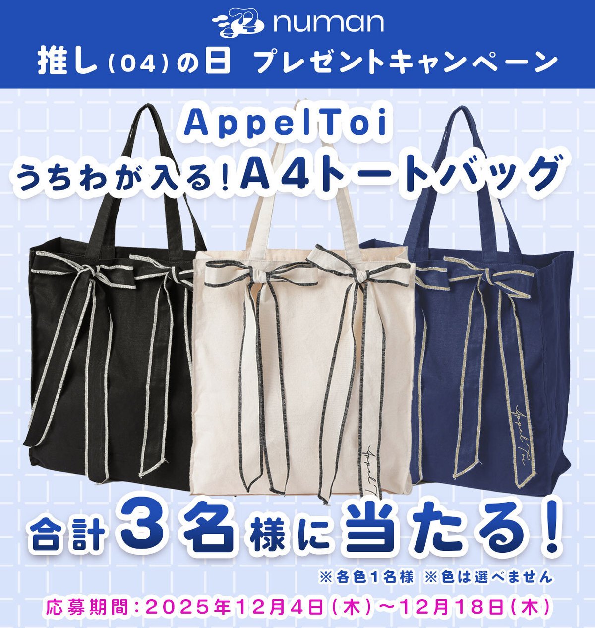 推し活グッズブランド「Appel Toi (アペルトワ)」から、推し活にも通勤・通学にも使えるA4トートバッグをプレゼント!ブラック・アイボリー・ネイビーの3色からランダムで1名様ずつ、合計3名様に当たります。