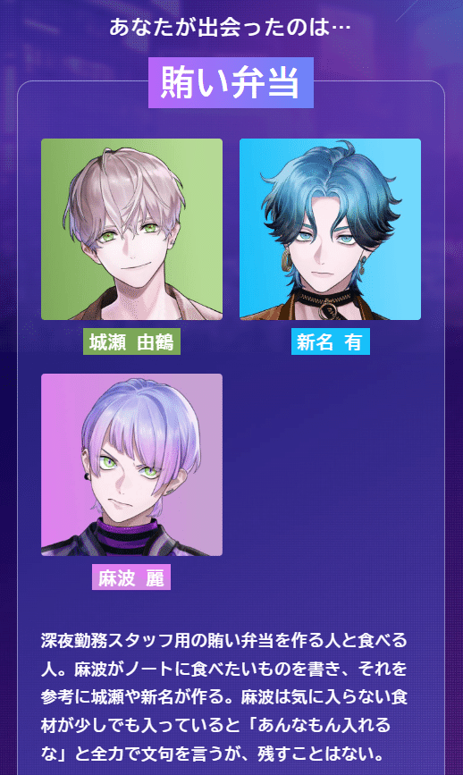 深夜勤務スタッフ用の賄い弁当を作る人と食べる人。麻波がノートに食べたいものを書き、それを参考に城瀬や新名が作る。麻波は気に入らない食材が少しでも入っていると「あんなもん入れるな」と全力で文句を言うが、残すことはない。