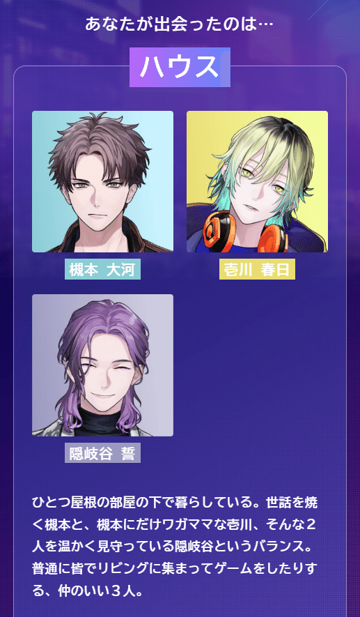 ひとつ屋根の部屋の下で暮らしている。世話を焼く槻本と、槻本にだけワガママな壱川、そんな2人を温かく見守っている隠岐谷というバランス。普通に皆でリビングに集まってゲームをしたりする、仲のいい3人。
