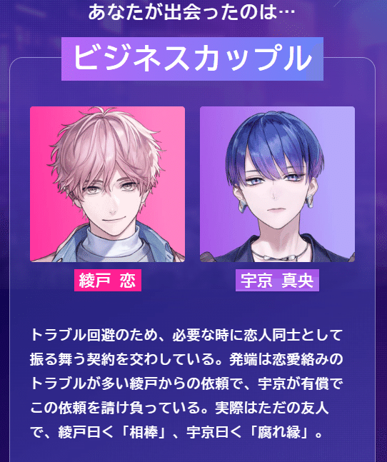 トラブル回避のため、必要な時に恋人同士として振る舞う契約を交わしている。発端は恋愛絡みのトラブルが多い綾戸からの依頼で、宇京が有償でこの依頼を請け負っている。実際はただの友人で、綾戸曰く「相棒」、宇京曰く「腐れ縁」。