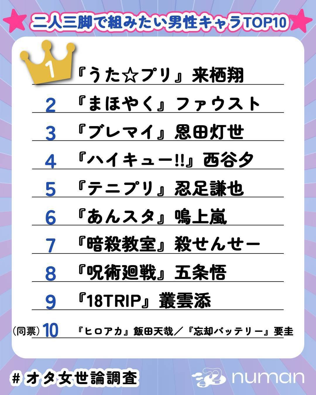 numan編集部では「二人三脚で組みたい男性キャラは?」というアンケート調査を実施し、結果をランキング化しました。